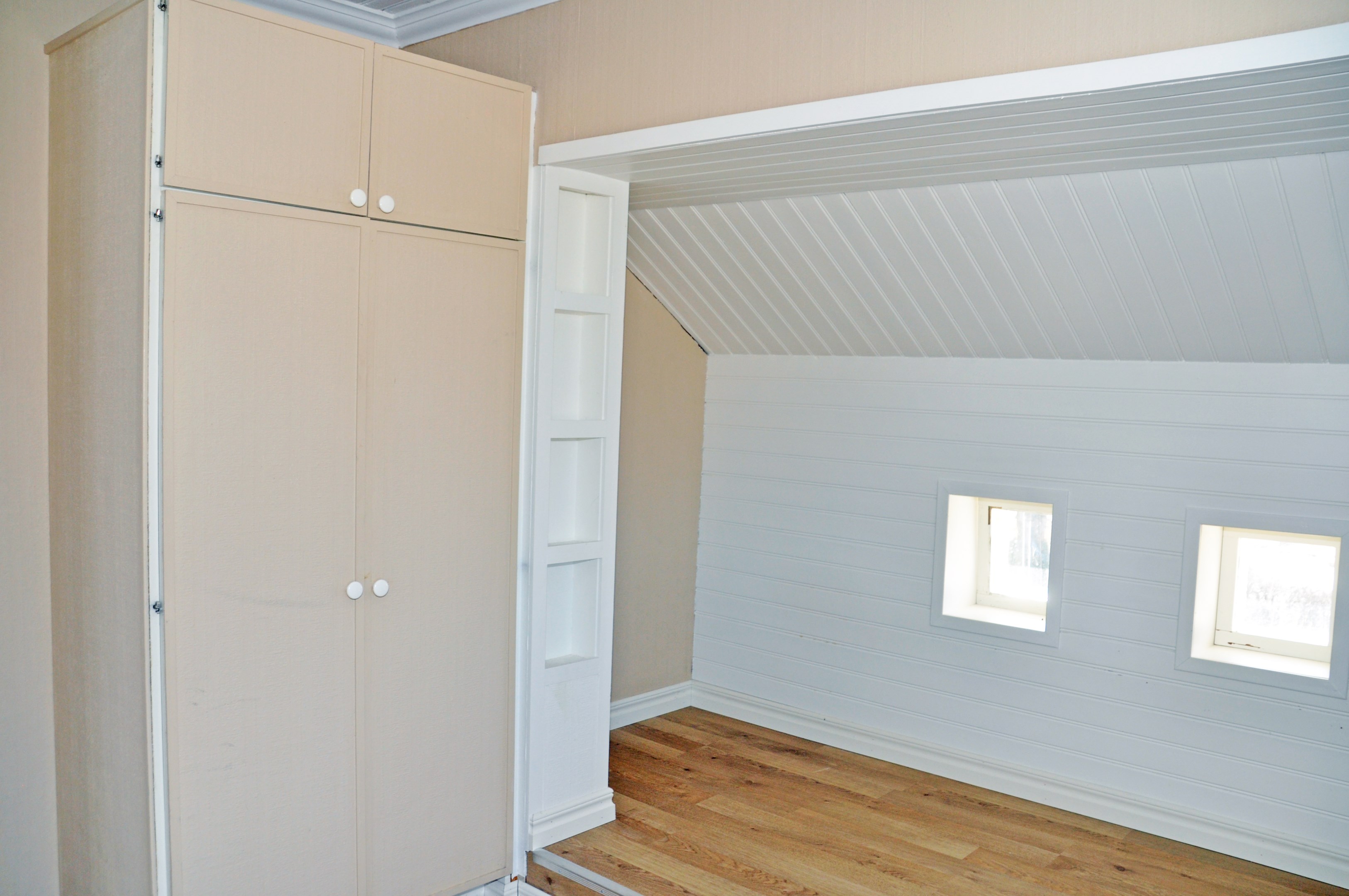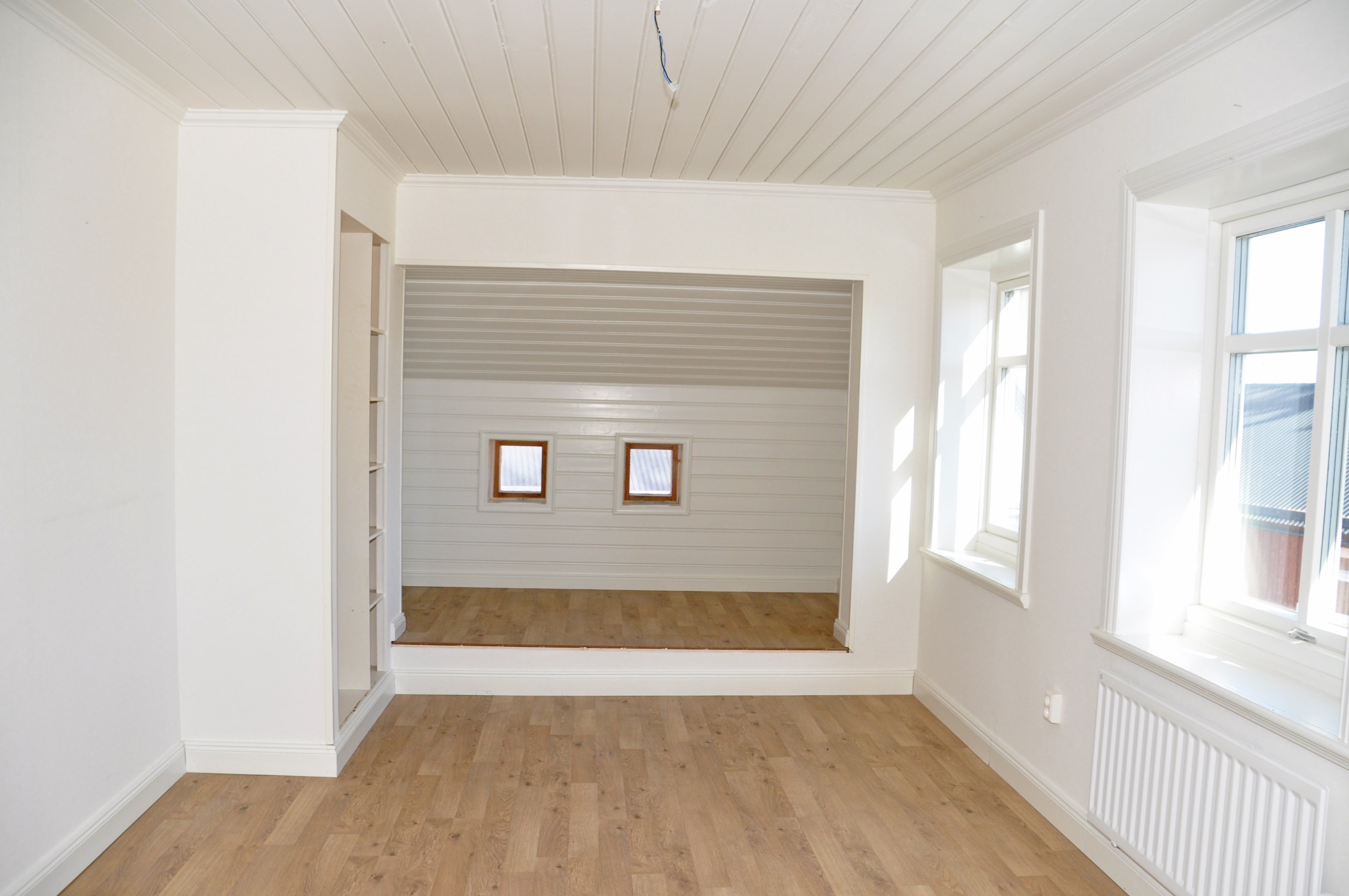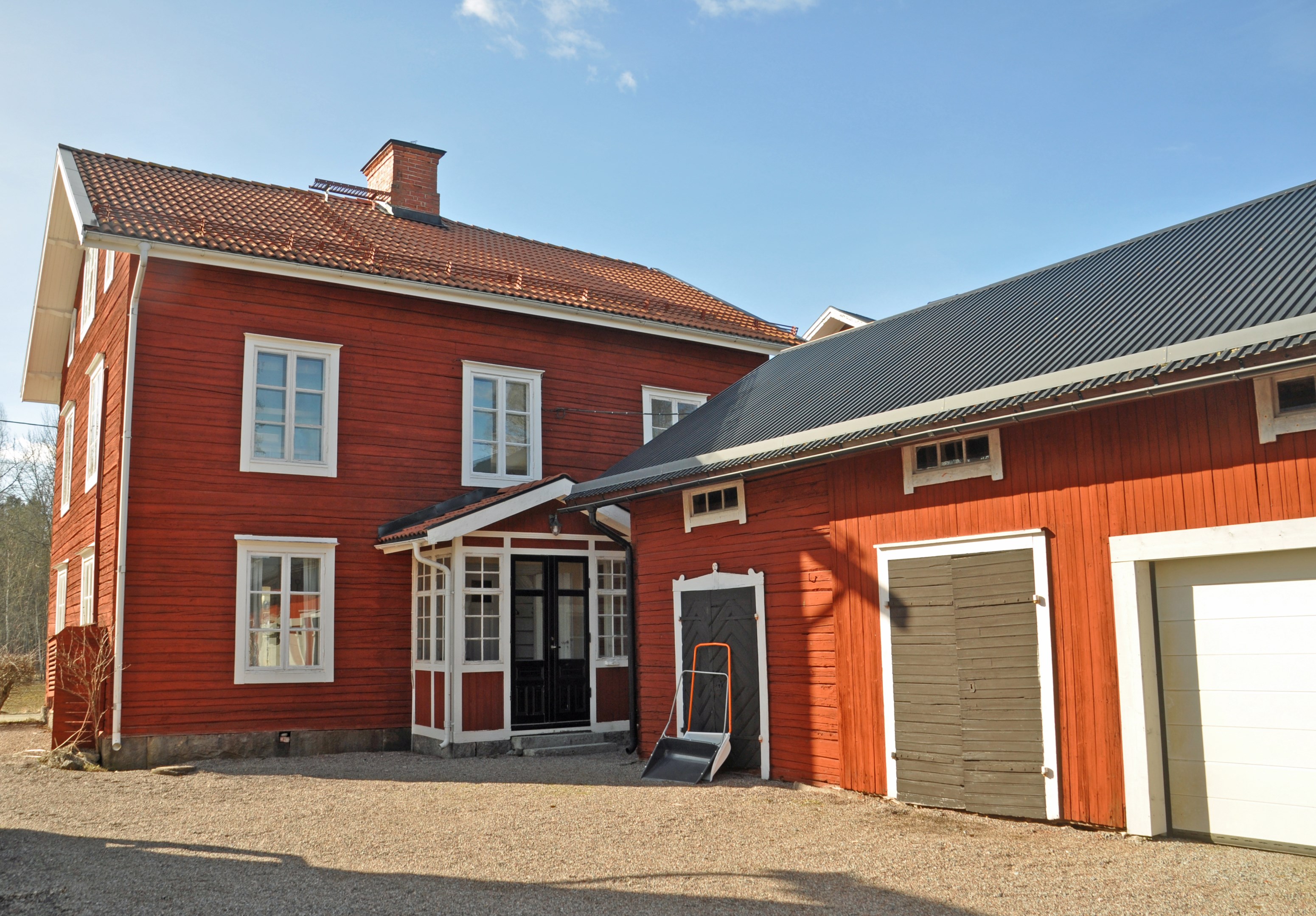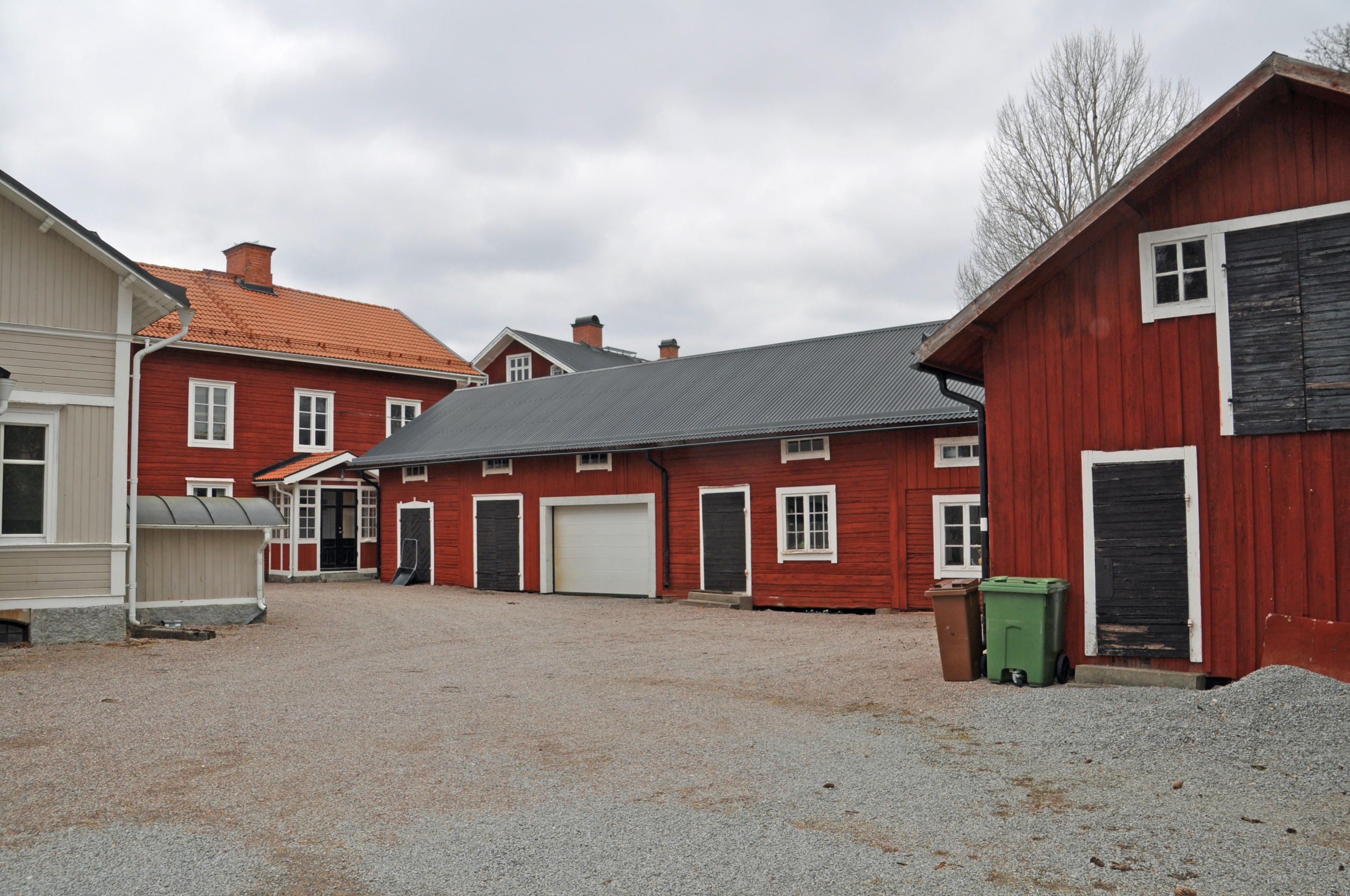 Uthuslänga i 1½-plan ca 190 kvm bruttoarea med bodar och kallgarage, hel övervåning, el.