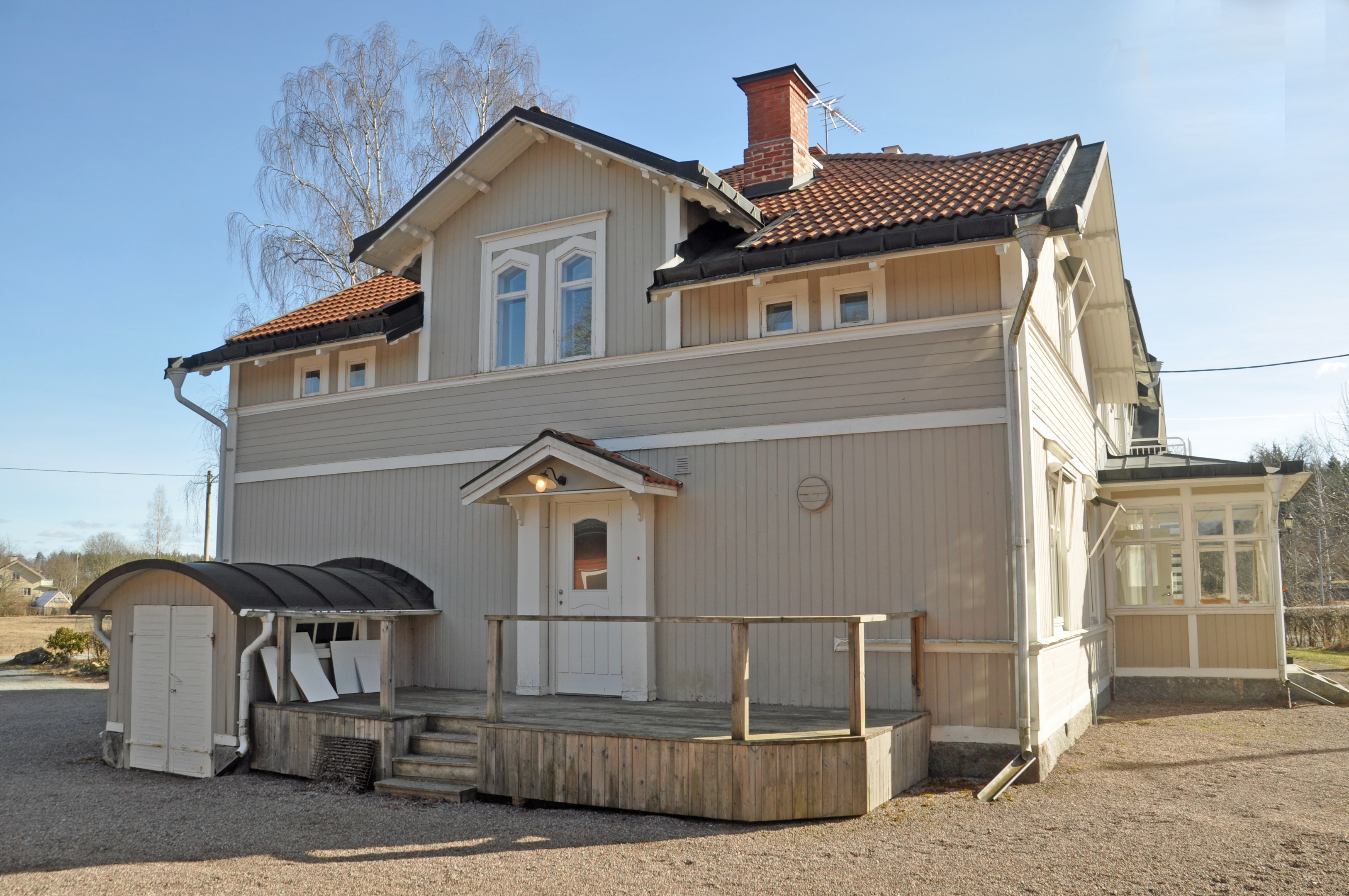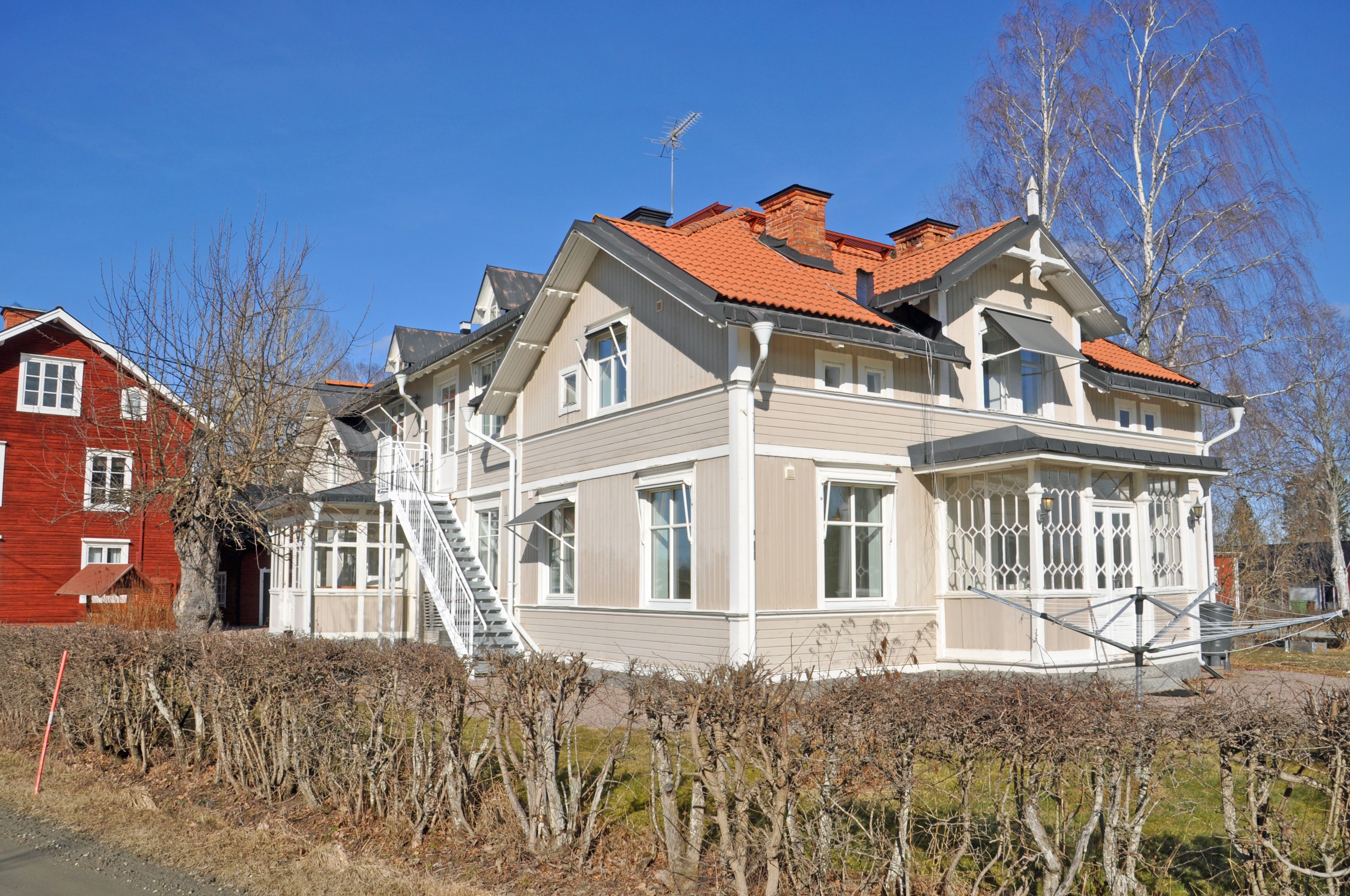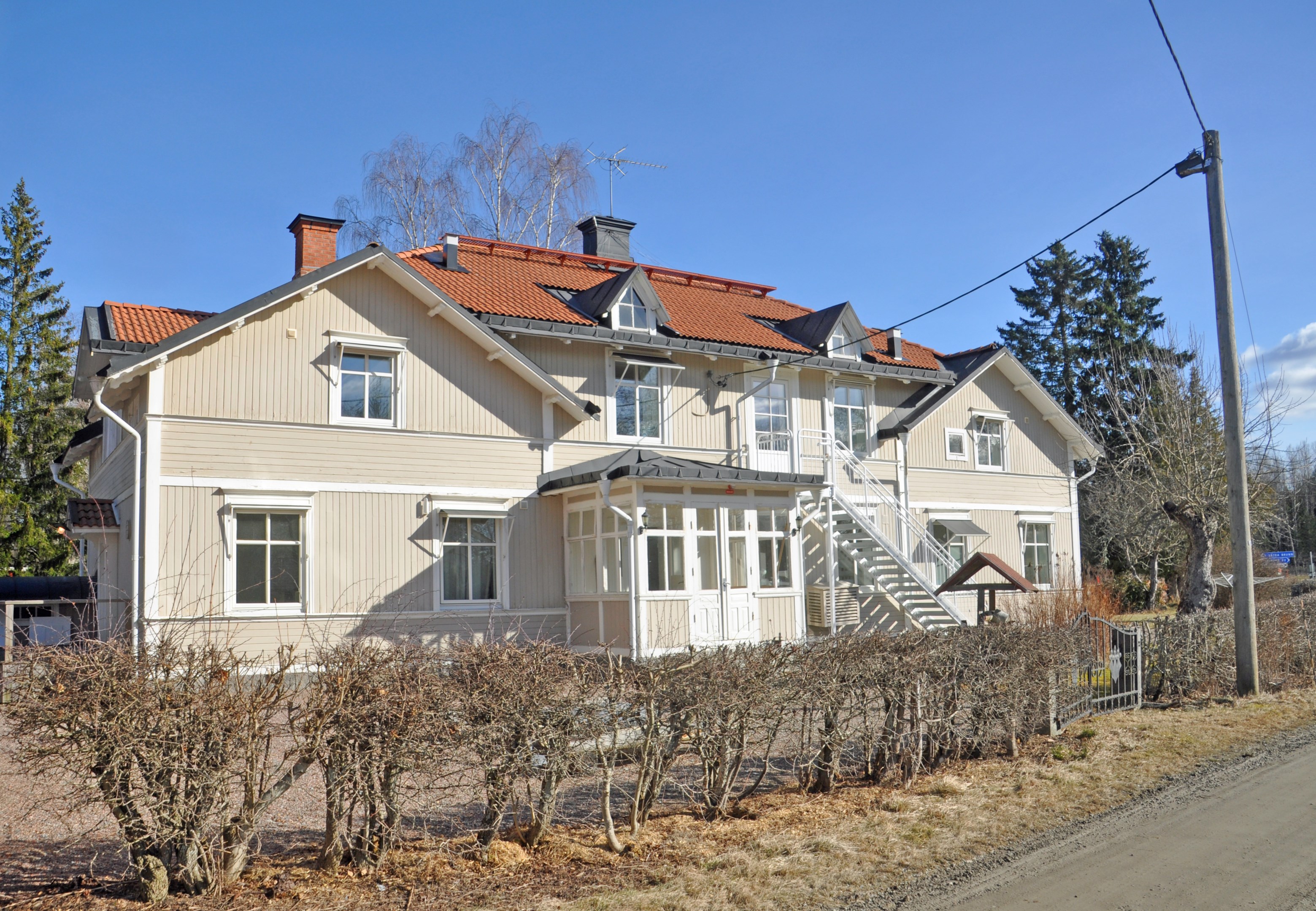 2-planshus med en liten källardel. 3 st lägenheter på övervåning, 2 st lägenhet på bottenvåning samt allmänna rum. 2-plans timmer hus med torpargrund och tegeltak. Enkelglas med innanfönster.